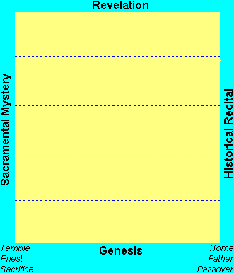 We need now to imagine for ourselves a diagram consisting of a broad vertical bar. The left edge of this bar is headed Sacramental Mystery and the right edge is Historical Recital (with the bar wide enough for comparisons and interrelationships to be plotted between the two edges). Our study will develop the bar from the bottom up—a charting through the Bible the development of the Hebraic-Jewish tradition regarding these two forms of worship.